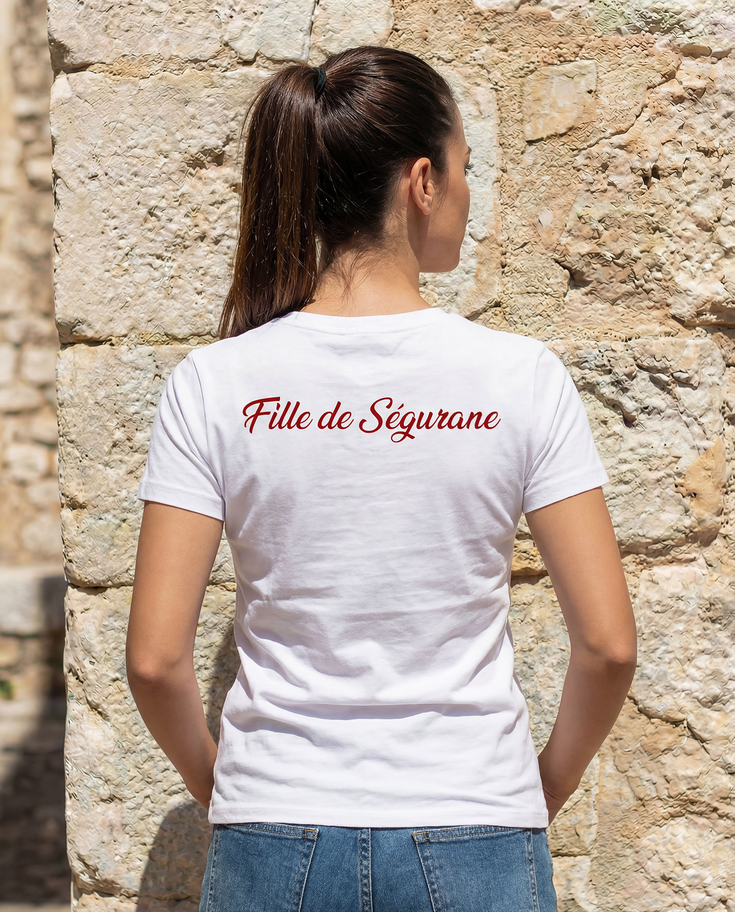 T-shirt blanc femme, lettrage rouge dans le dos « Fille de Ségurane », motif recto poitrine « Catherine Ségurane ». Composition : 100% coton. Fabriqué en Europe.